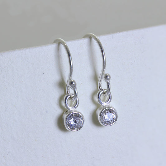 Regular price£24.00Tiny Sterling Silver 3mm Clear CZ Round Rubover Fishhook Dangle Earrings