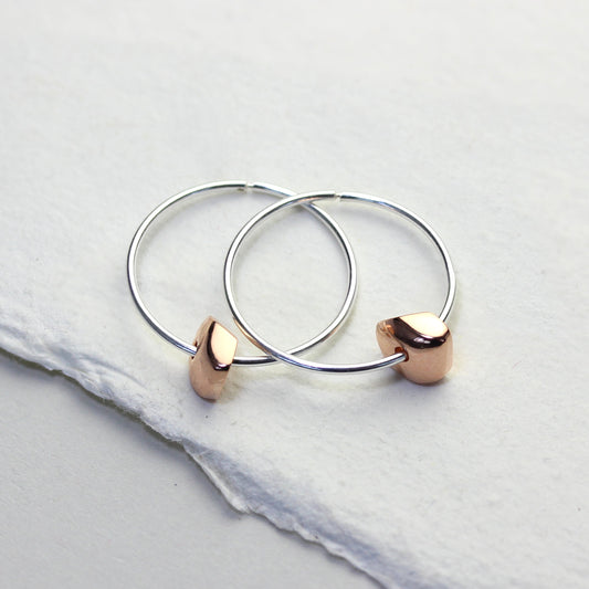 Sterling Silver 14mm Hoop Earrings with Rose Gold Plated Nugget Bead Charms