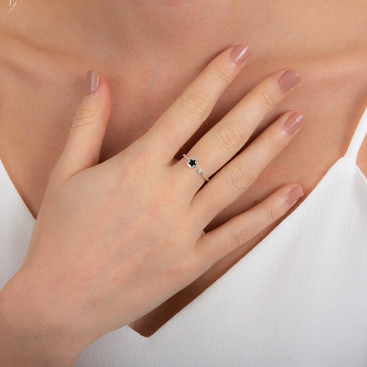 Sterling Silver Star Black Enamel Disc and CZ Open Adjustable Ring