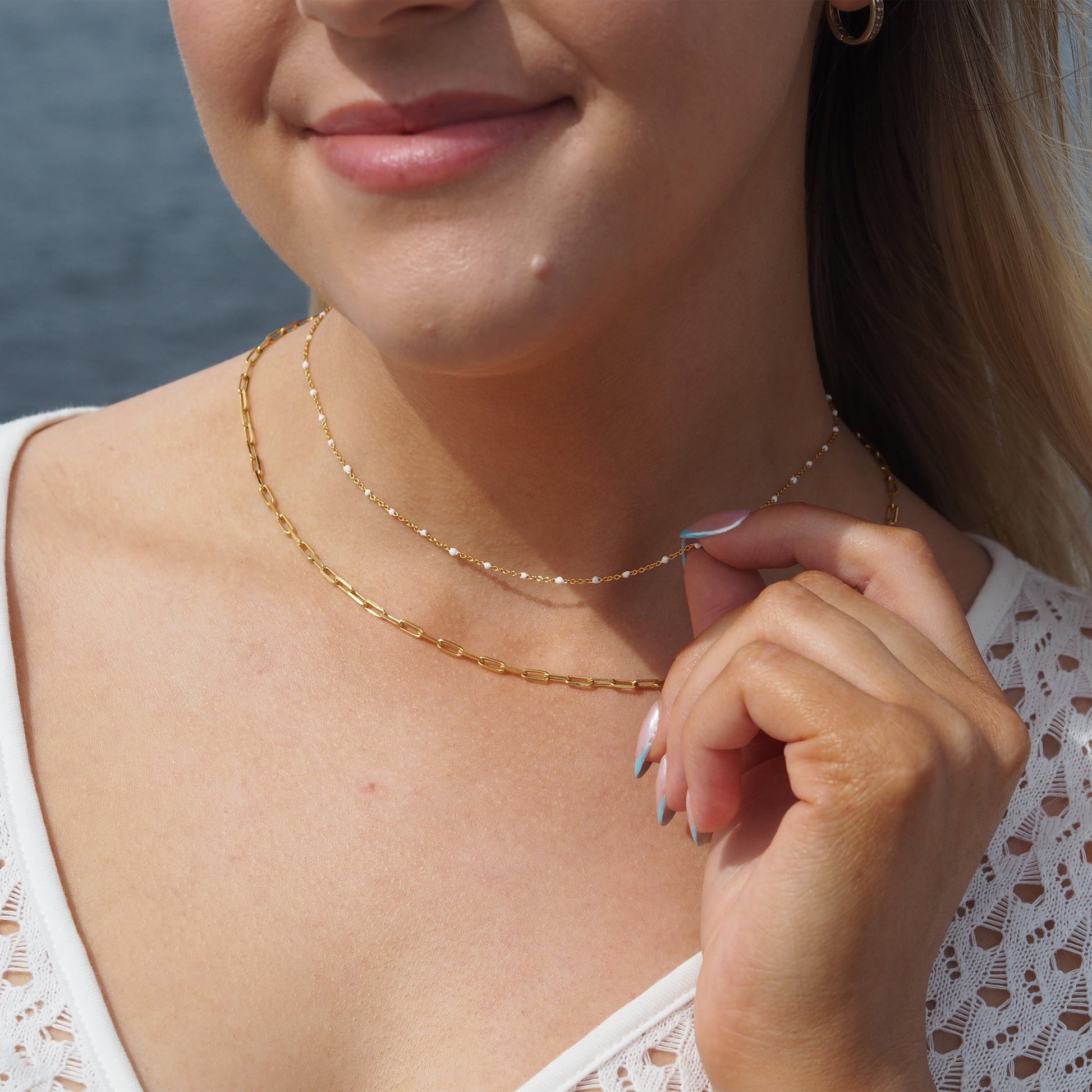 Fine Gold Plated Sterling Silver & White Enamel Confetti Chain Necklace - 16 Inches