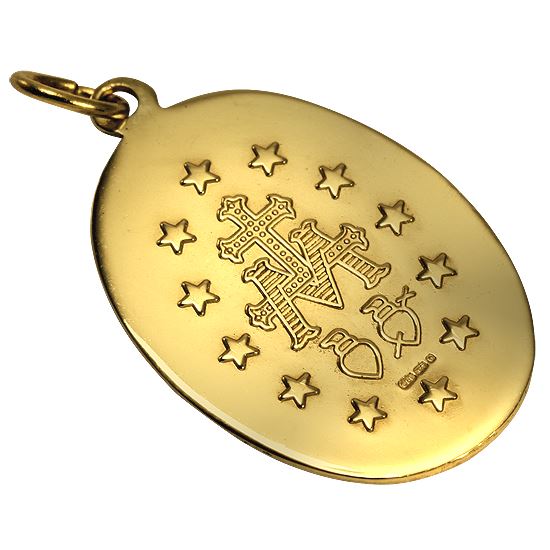 This miraculous Mary pendant is constructed from beautiful 9ct yellow gold with an embossed design on both sides of its oval form. It stands at 33mm tall including the jump ring which is used to thread it onto your chosen necklace chain. We stock a range of suitable options on our site for you to choose from! The pendant is 18mm wide and weighs 4 grams.