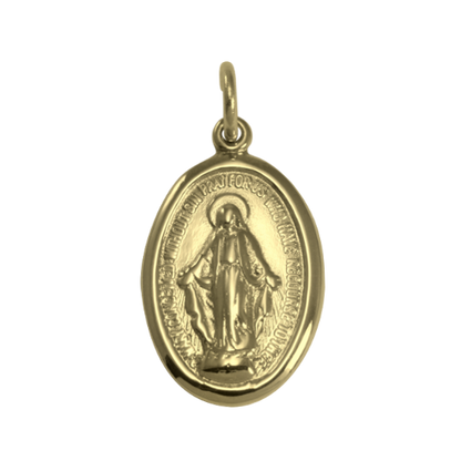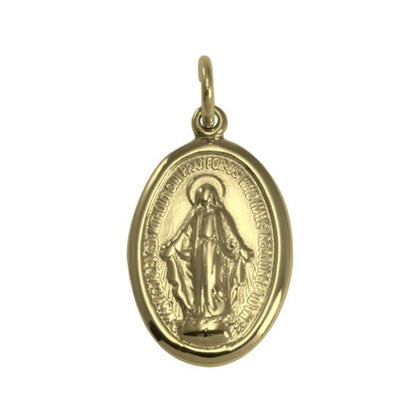 Featuring a contemporary, matt finish, this small miraculous Mary pendant is a wonderful gift item to celebrate an important religious celebration. The 9ct yellow gold pendant has an oval shape and measures 18.2mm tall x 12mm wide and weighs 1.5 grams. Both the front and reverse each carry half of the components that make up the miraculous Mary design which signifies the miraculous conception and the love shared between Jesus and his mother.