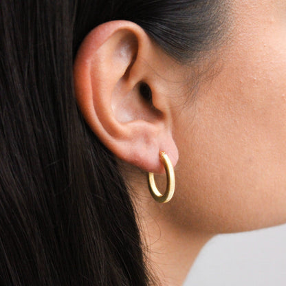 All our hoop earrings are measured by their external diameter. This means we measure from the outer edge on one side to the outer edge on the other. This ensures you’re getting the true size of the hoops when worn.