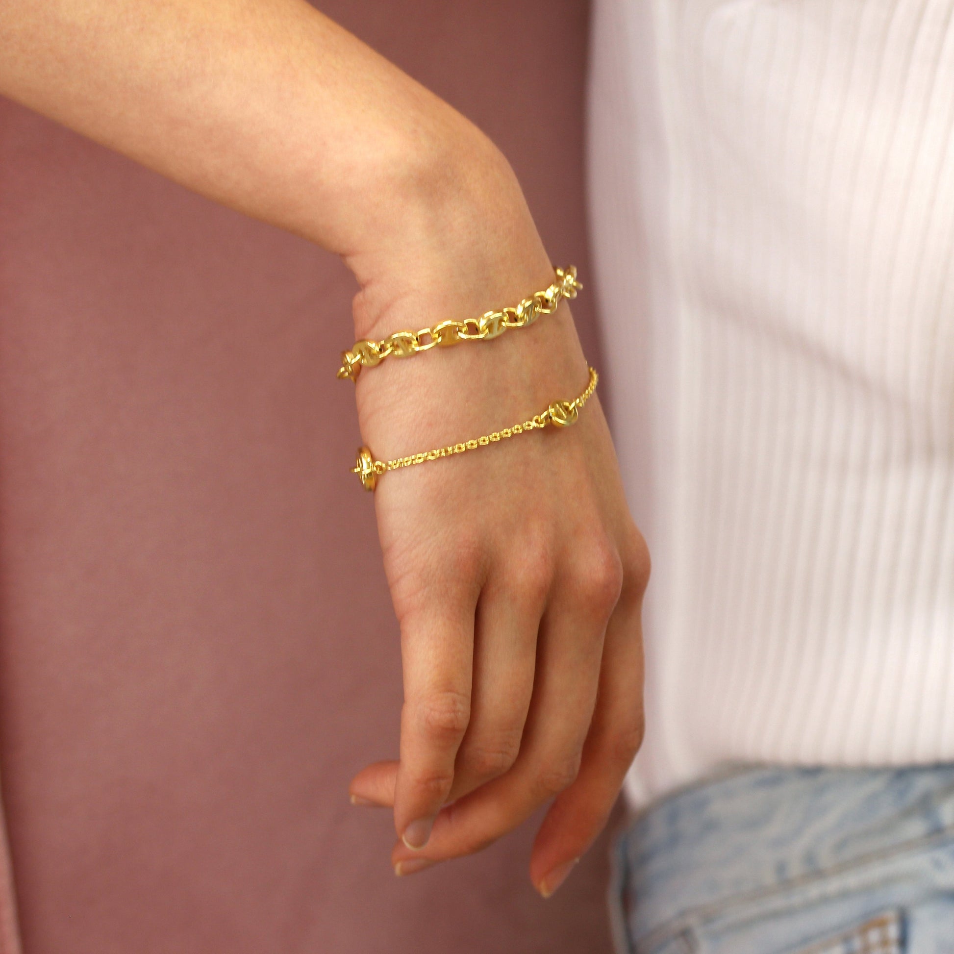 a simple bracelet is the perfect way to accessorise any outfit and this gold plated sterling silver one would be a great addition to your collection! it's 8 inches long and weighs 3.2g. the chunky ovals sit along a 2mm thin belcher chain and they measure 10mm x 12mm x 2mm. you fasten it with a lobster claw clasp which makes it easy to put on.