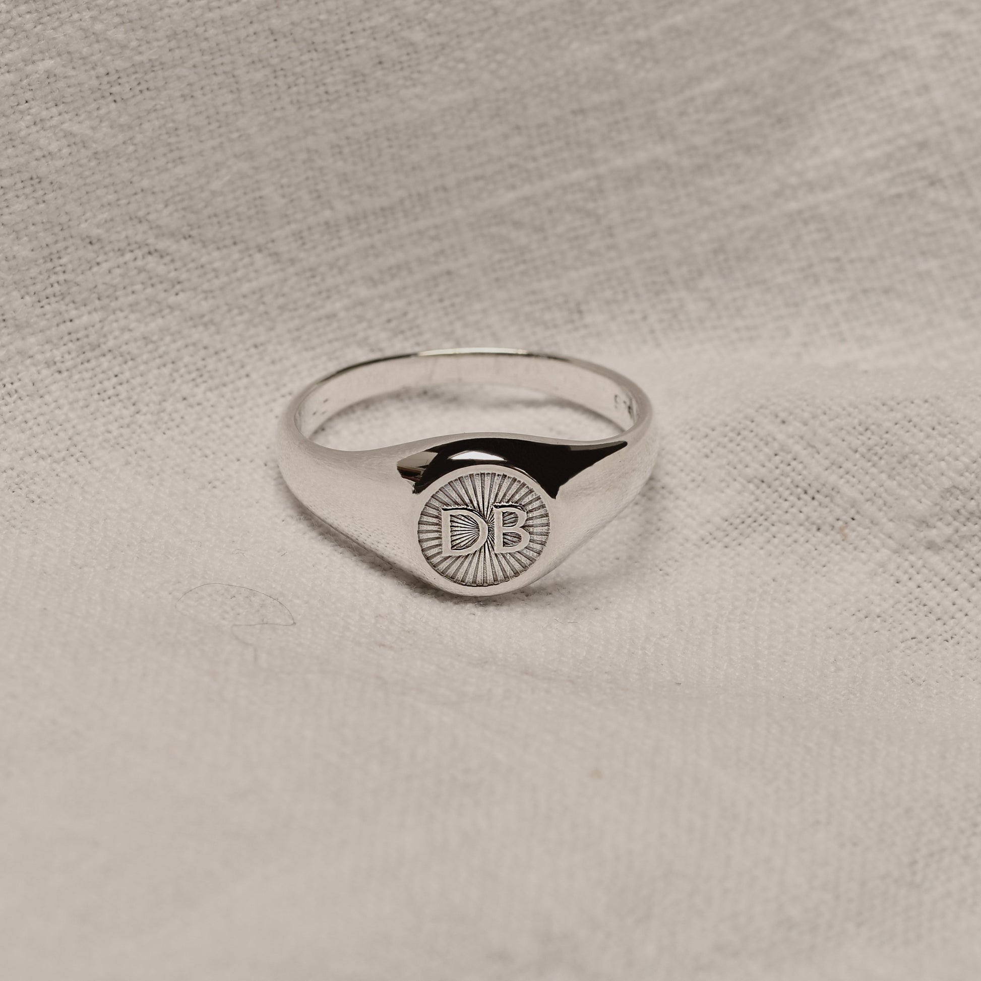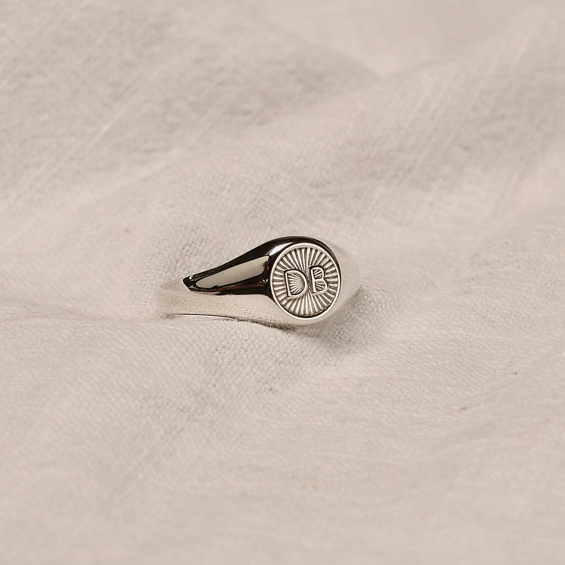 Personalised Sterling Silver Round Starburst Initial Signet Ring Size J - Z+1