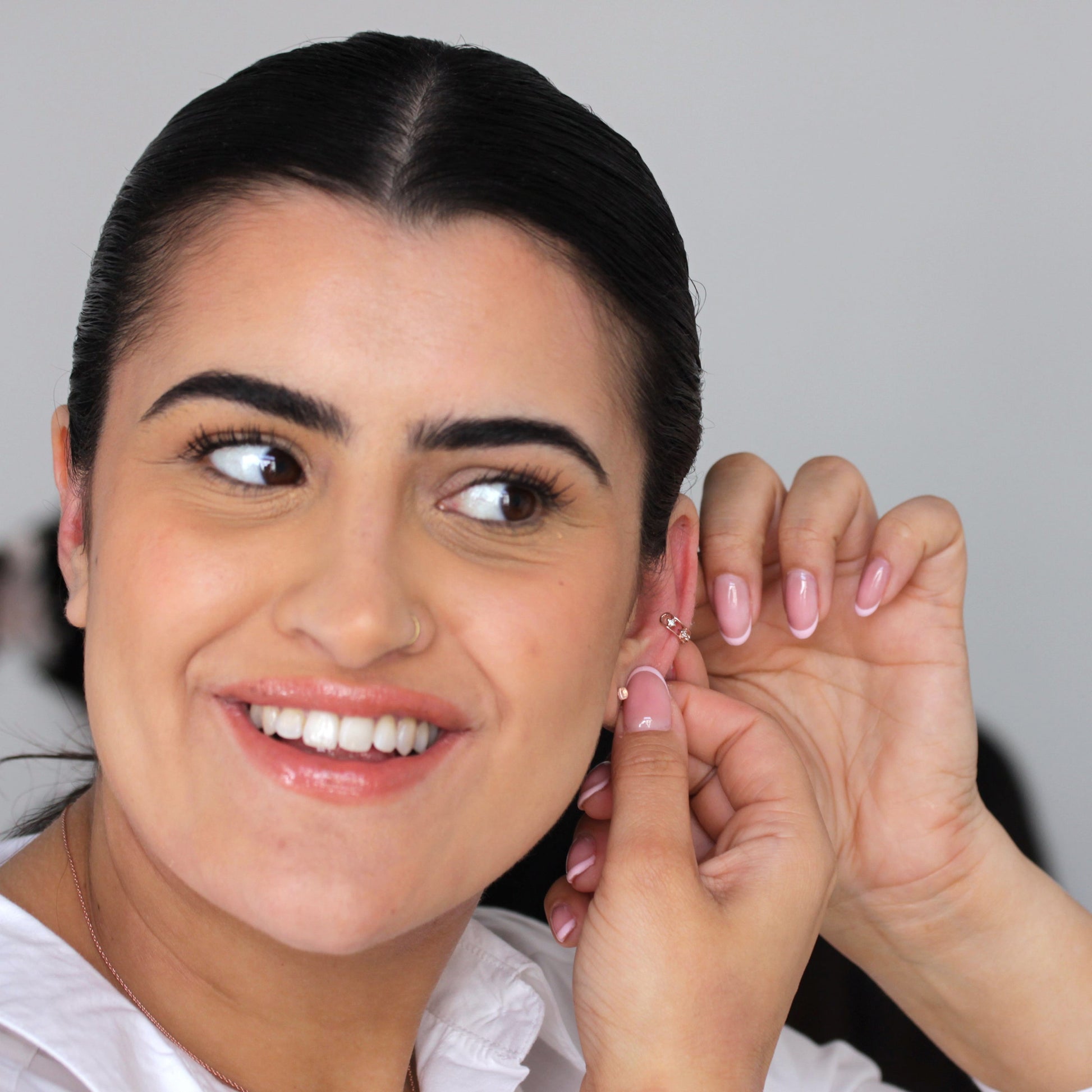 All our hoop earrings are measured by their external diameter. This means we measure from the outer edge on one side to the outer edge on the other. This ensures you’re getting the true size of the hoops when worn.