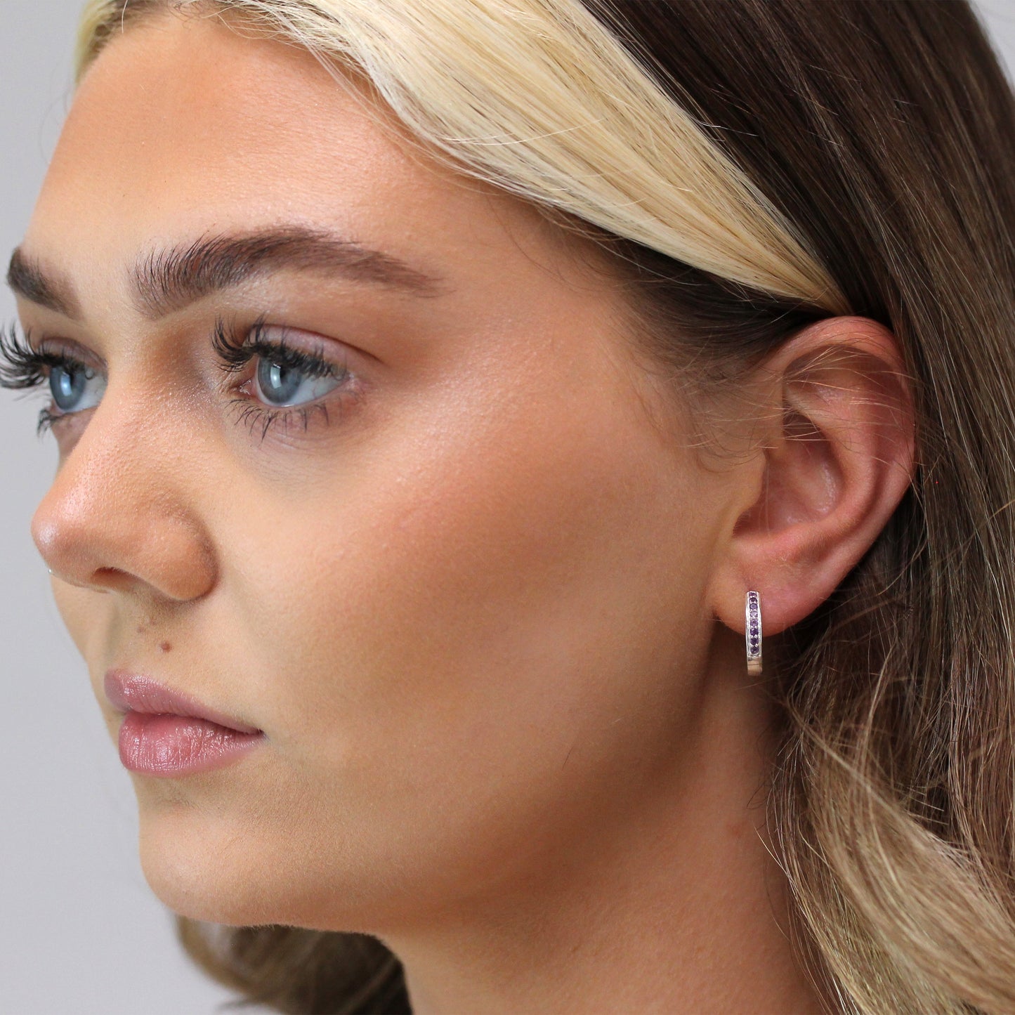 Sterling Silver Amethyst CZ Pave 15mm Huggie Hoop Earrings