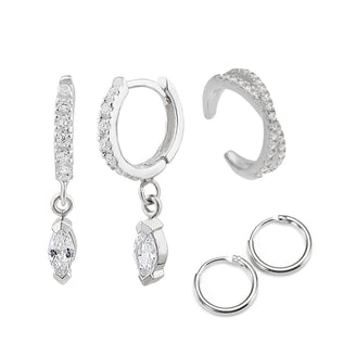 Sterling Silver CZ Charm Huggies & Hoops & Cross Cuff Earrings Set