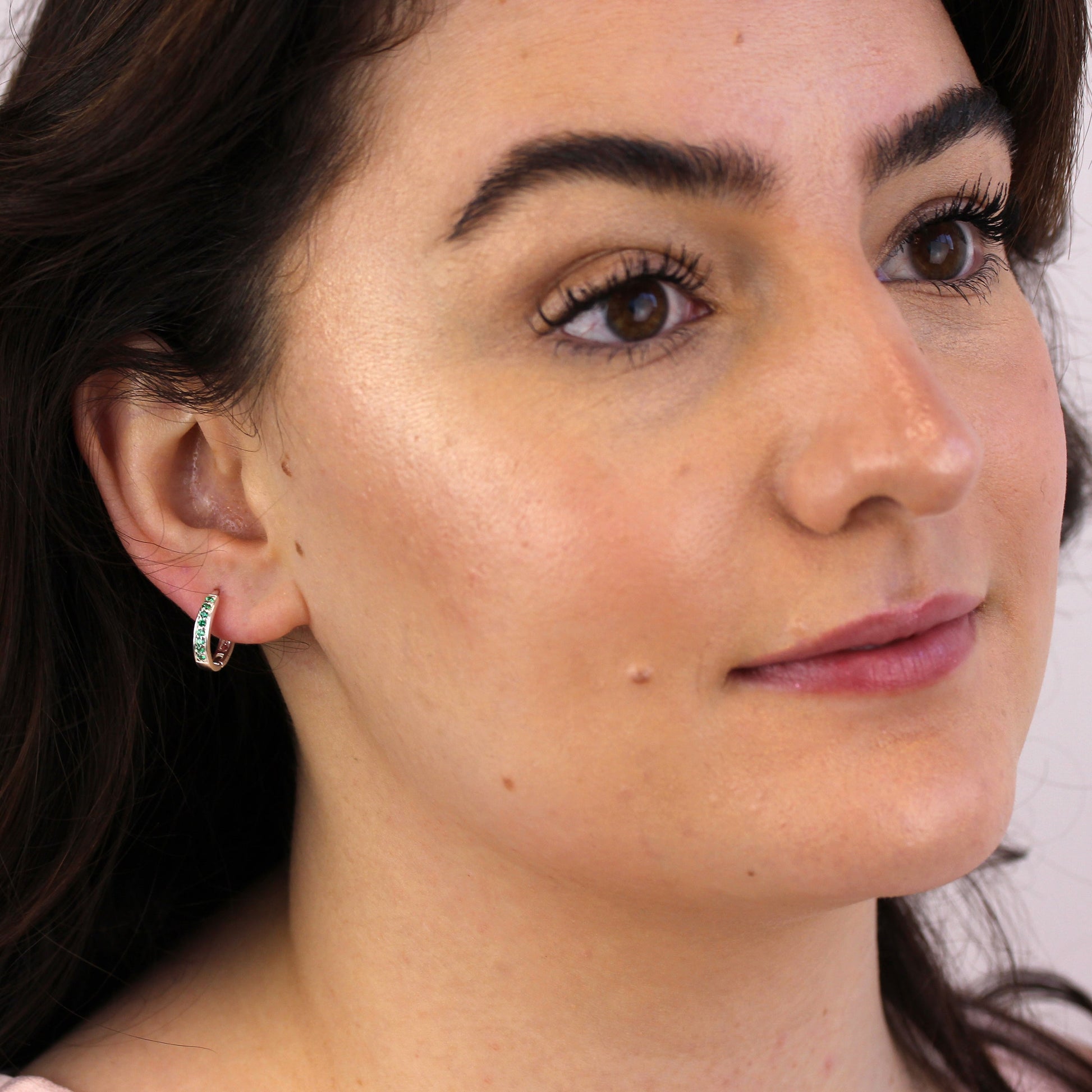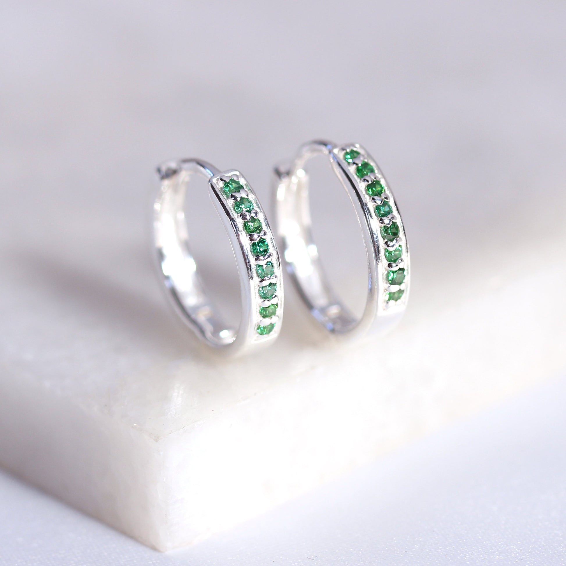 Sterling Silver Emerald CZ Pave 15mm Huggie Hoop Earrings