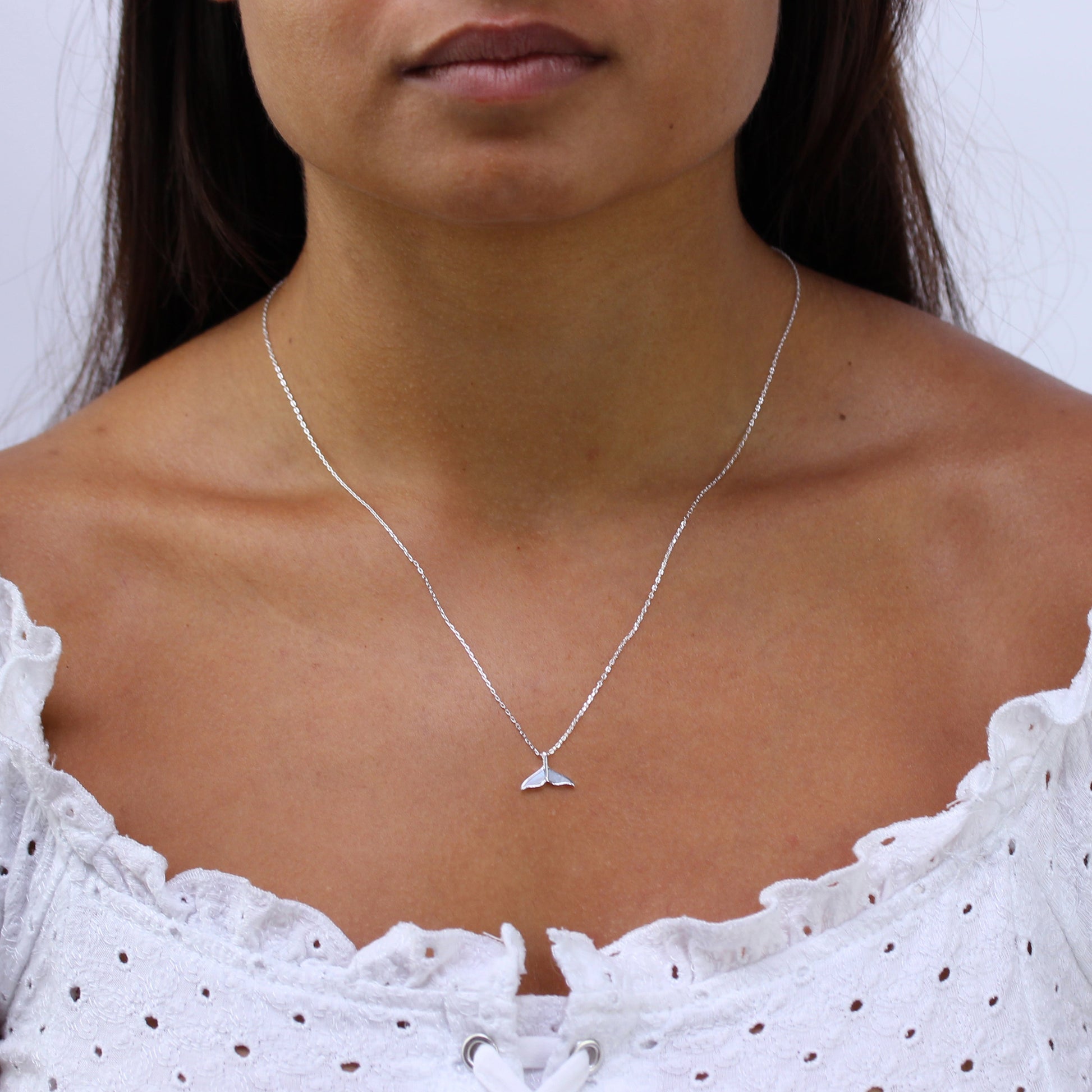 Celebrate the beauty of the natural world with this whale tail pendant necklace, set with lustrous mother of pearl. Measuring 9mm x 13mm x 2mm, the sterling silver pendant hangs from a jump ring along a delicate matching belcher chain with a spring ring clasp. We love how the natural colours and patterns in the mother of pearl reflect the ocean waves of the whale's natural habitat, and think this elegant necklace will be a hit with older children, teens and adults alike.