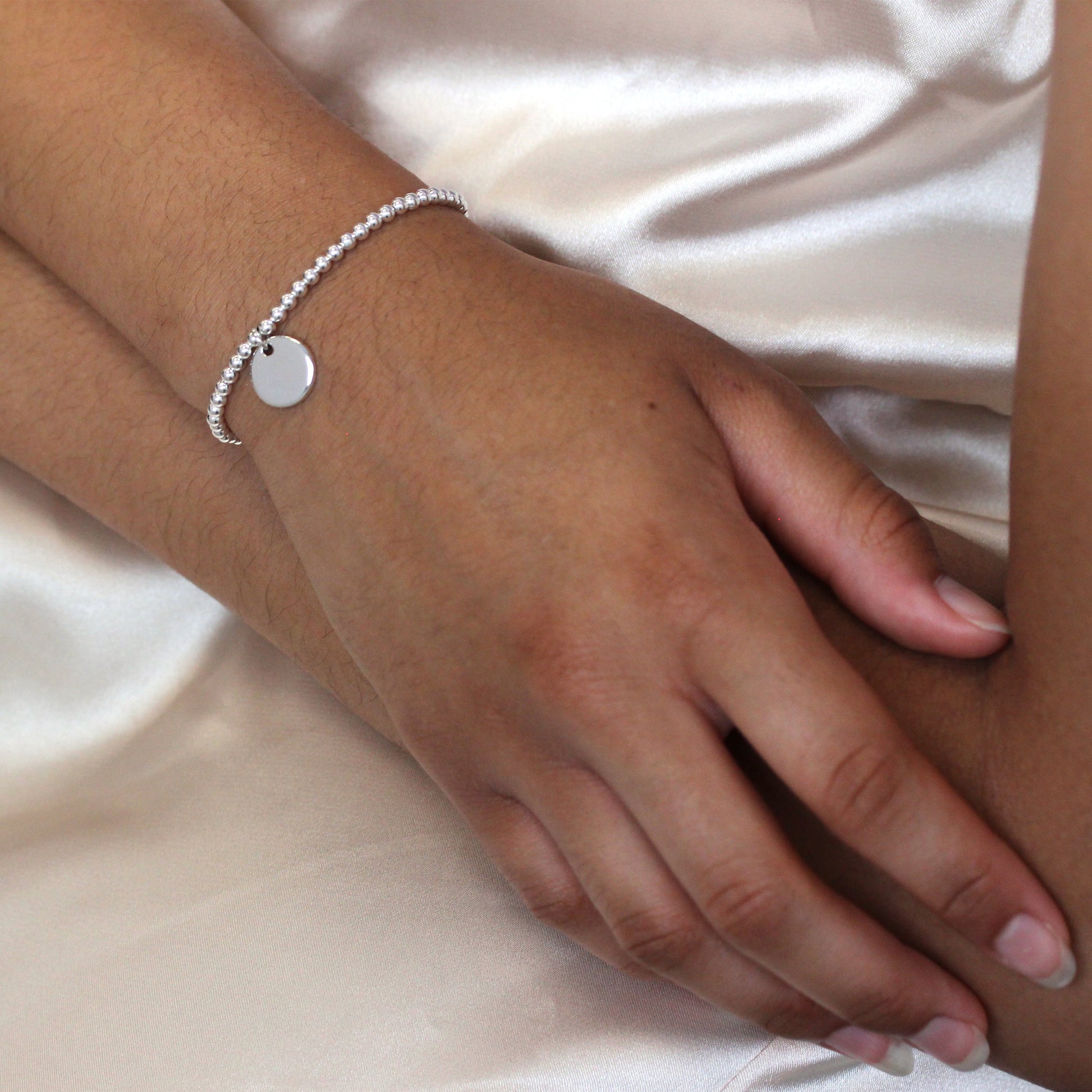 Sterling Silver Stretchy 6 Inch Bead Bracelet with Engravable Round Tag