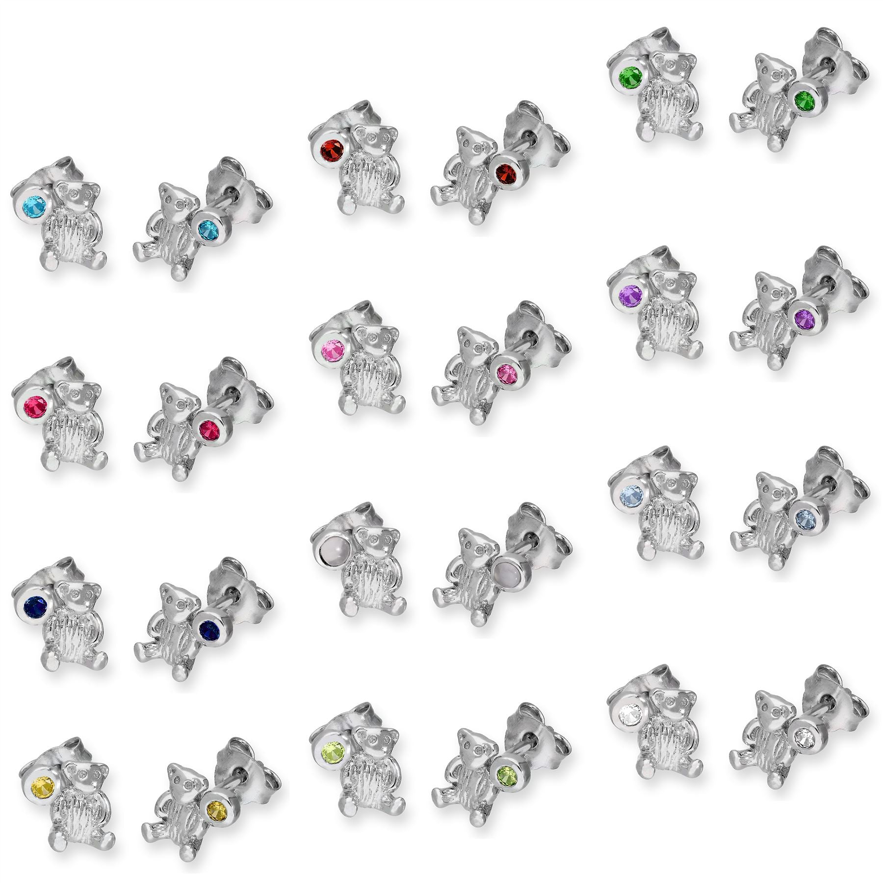 Sterling Silver Teddy Bear & CZ Crystal Birthstone Stud Earrings
